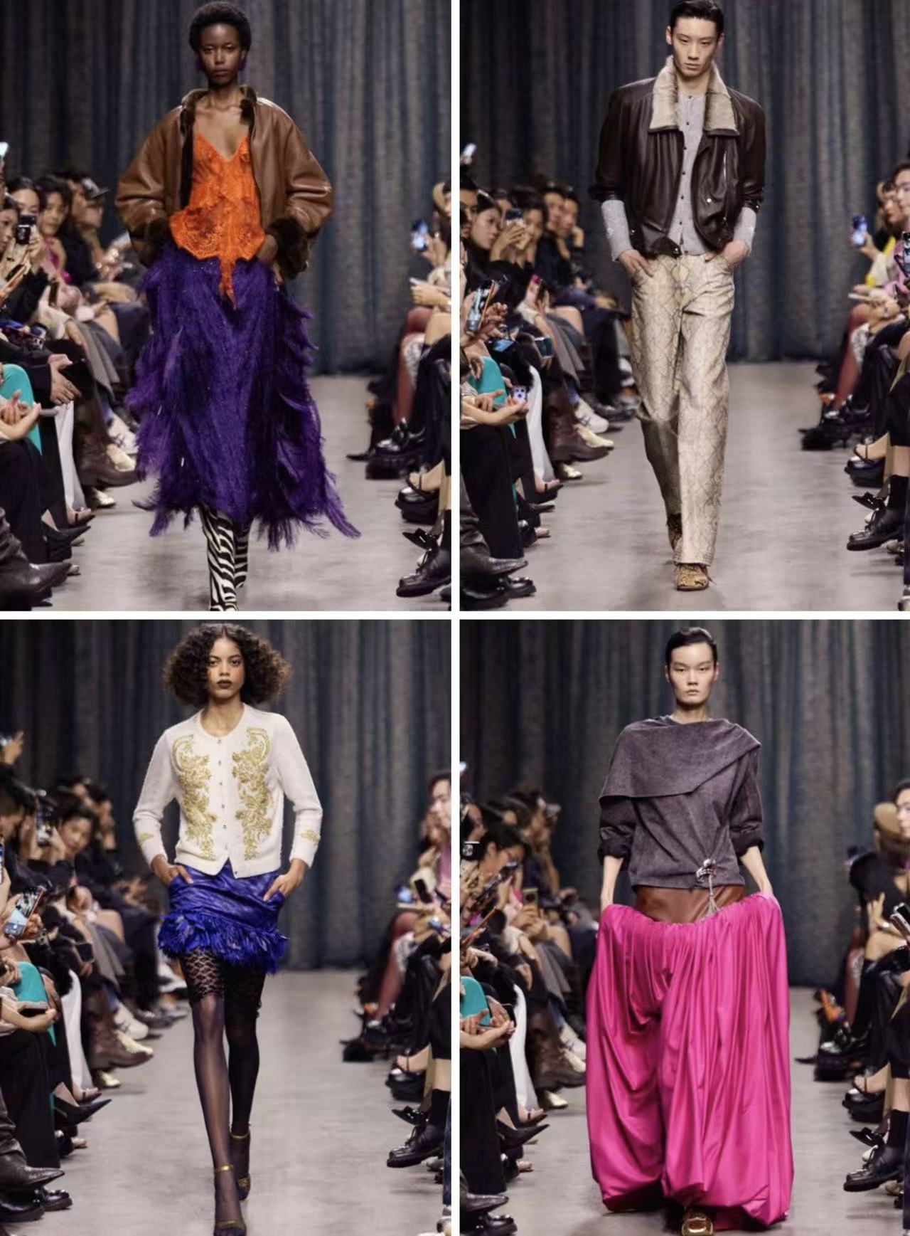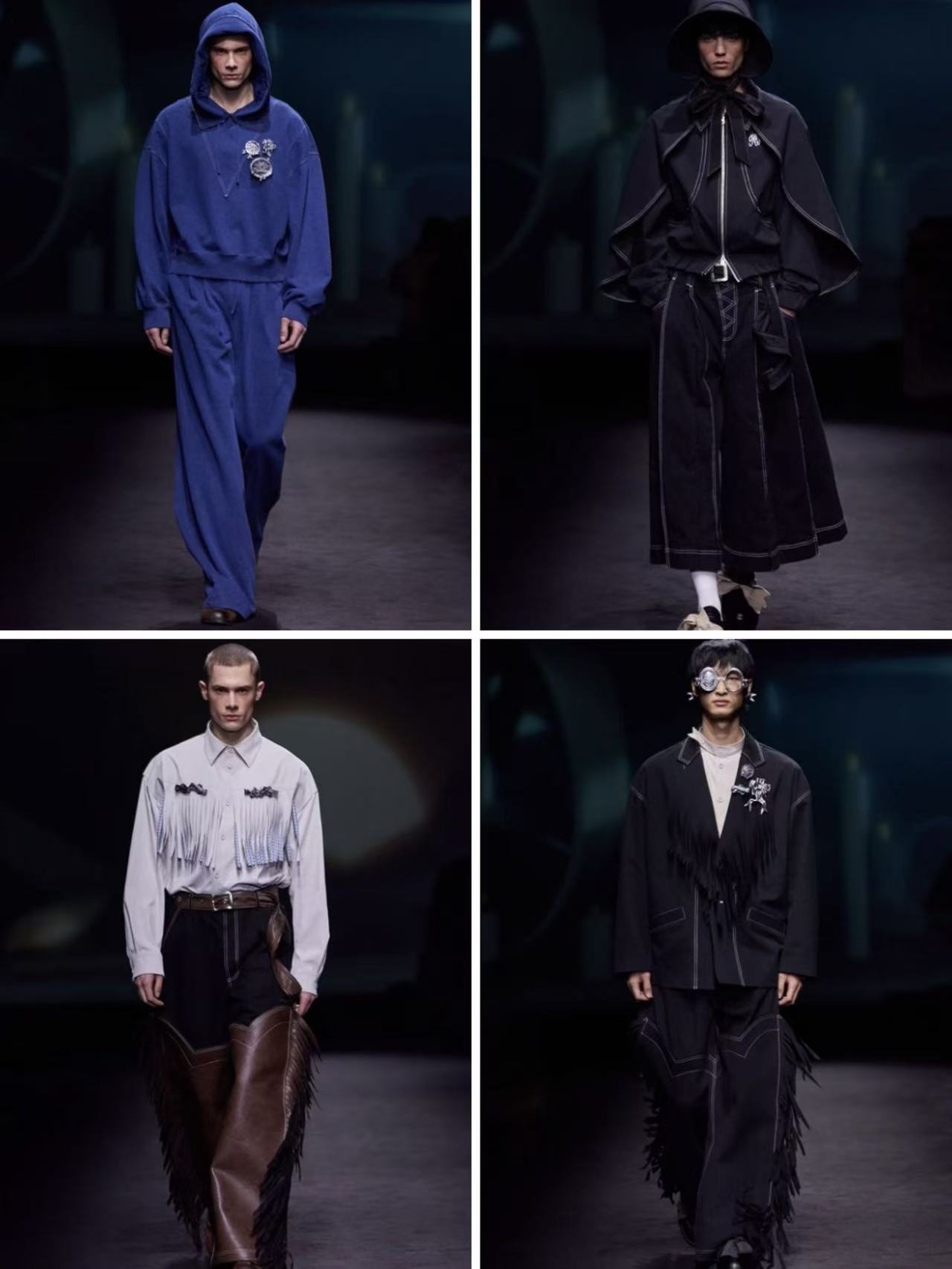 Feng Chen Wang以中国哲学“两仪”为灵感本源,构筑“山海能量场”创作核心,以秩序与本能、理性与混沌彼此制衡又共生共存为设计内核。秀场之上,品牌以松紧并置的解构剪裁、厚重与轻盈碰撞的材质对比,完整诠释“两两共生,息息相行”的设计理念,将矛盾中的动态平衡与前行力量转化为直观的时装语言。该品牌由设计师王逢陈创立,以解构主义剪裁、无性别穿搭、一衣多穿的实用哲学为标志性风格,持续以东方美学为根基,融合东西方设计语言,在本次T台呈现中再度展现中国先锋设计的国际水准。