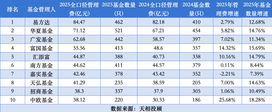 根据天相投顾数据,2025年总管理费排名前四的基金公司仍然是易方达、华夏、广发和富国,与2024年完全一致;天弘和招商也分别守住了第八、第九的位置。