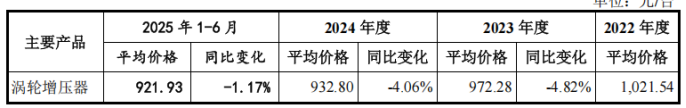 但在销量与市场份额增长的同时,丰沃股份核心产品涡轮增压器的售价却呈连年下滑态势。报告期内,产品均价分别为1021.54元/台、972.28元/台、932.8元/台、921.93元/台,其中2025年上半年均价同比下滑1.17%。