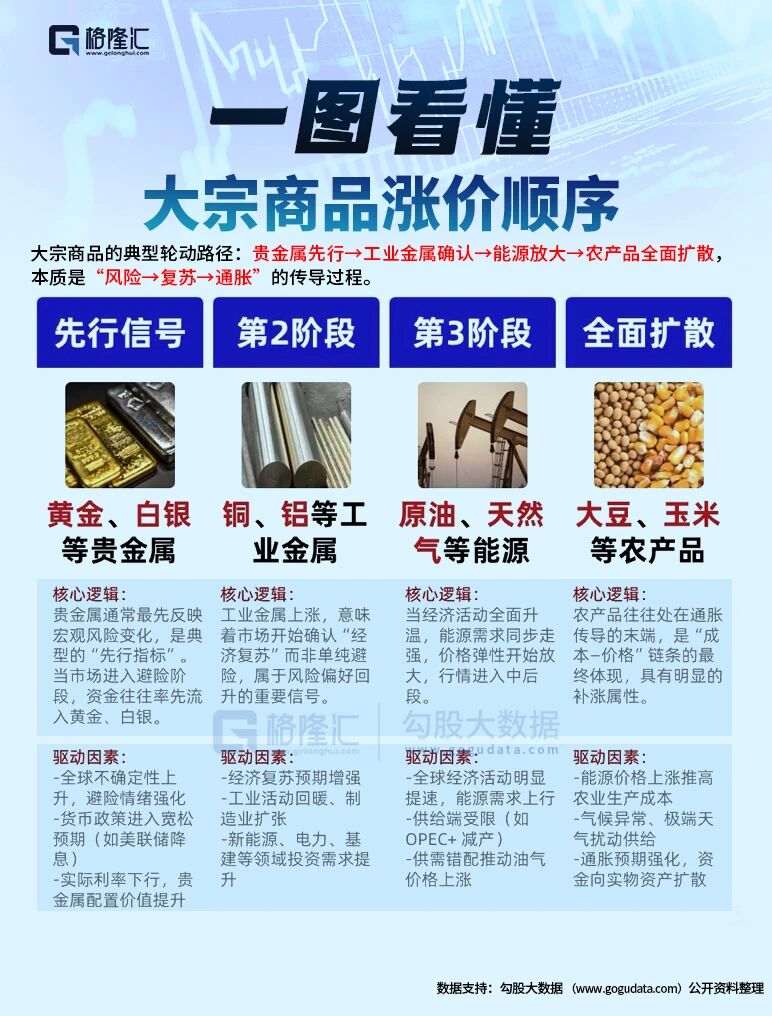 根据中信建投等研究机构的观察,历史上,自1970年以来的几次大宗商品市场行情的逻辑传导路径:贵金属先行→工业金属确认→能源放大→农产品全面扩散。