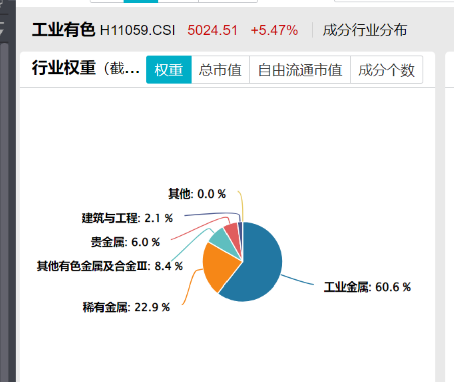 从中证三级行业分布来看,工业有色由60.6%的工业金属(其中主要为铜29.2%、铝26.7%),22.9%的稀土,6.0%的贵金属组成。