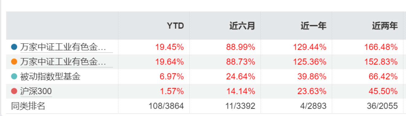 截至1月23日,工业有色ETF万家(560860)近1年收益为129.44%,在同期2893只只被动指数基金中排名4/2893。