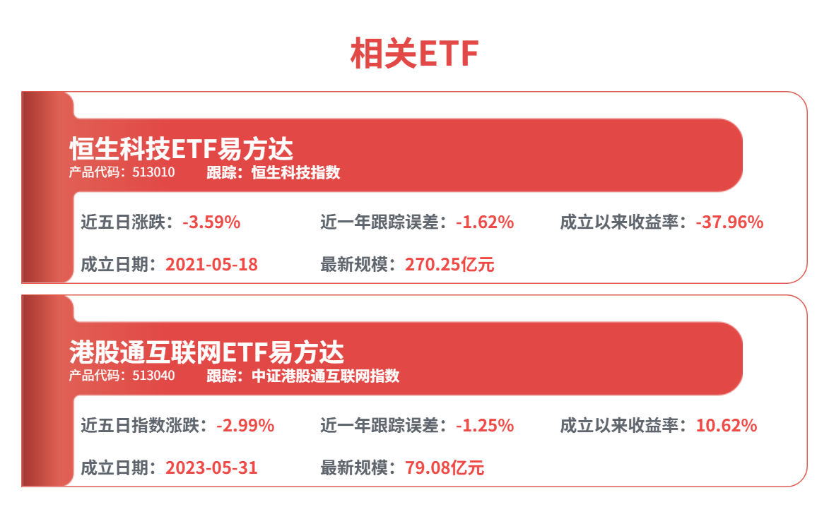 面对当前投资机会,可以关注恒生科技 ETF 易方达(513010)和港股通互联网ETF易方达(513040)作为把握港股互联网板块龙头价值的重要抓手,没有股票账户的投资者可以关注易方达恒生科技ETF联接基金(A类/C类:013308/013309)和易方达中证港股通互联网ETF联接基金(A类/C类:019313/019314)。