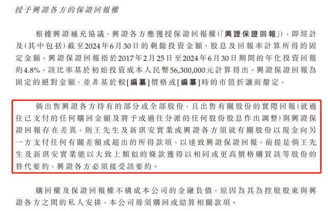 不仅如此,补充协议授予了协议股东保证回报权,具体的年化投资回报基于投资者的初始投资成本计算得出。若投资者出售有关股份的实际回报低于王小强及新琪安实业承诺的回报率,王小强方需以现金的方式补足差额。
