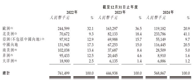 相比之下,新琪安来自欧洲、南美洲、非洲和大洋洲的收入却均出现了不同程度的回落,其中欧洲市场的收入由2022年的2.45亿元逐步降至2024年的1.19亿元,收入占比也由32.1%降至20.9%,缩减超10%。