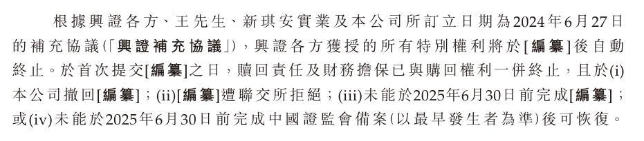 此前,王小强、新琪安实业和新琪安还与国信弘盛、兴证战略创业等投资者订立了补充协议,约定若新琪安未能在2025年6月30日前完成上市,其此前承诺的投资者特殊权益将进行恢复,包括董事会否决权、优先购买权、领售权等。