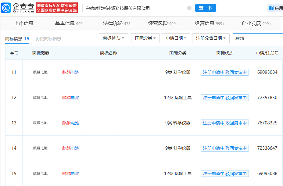 企查查APP显示,宁德时代已申请注册多枚“麒麟”、“麒麟电池”、“时代麒麟”商标,国际分类包括运输工具、科学仪器等。