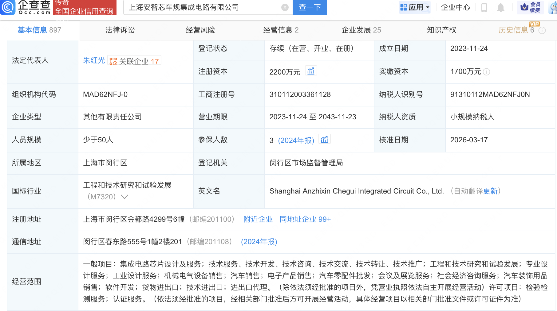 企查查APP显示,近日,上海安智芯车规集成电路有限公司发生工商变更,新增铭科精技(001319)、斯达半导(603290)等为股东,同时注册资本增至2200万元。企查查信息显示,该公司成立于2023年,经营范围包含:集成电路芯片设计及服务;汽车销售;电子产品销售;汽车零配件批发等。