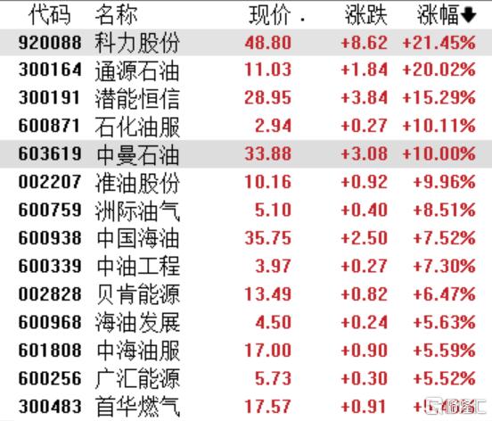 A股市场中,通源石油20cm涨停,潜能恒信涨超15%,石化油服、中曼石油、准油股份10cm涨停,洲际油气涨超8%,中国海油、中油工程涨超7%,贝肯能源、海油发展、中海油服纷纷上涨。