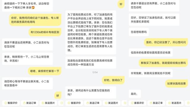 而当笔者询问客服飞猪“加速包”“专人帮抢”与12306官方候补功能的区别时,客服表示,平台会为购买加速包的用户开启线上、线下同时抢票,订单将分配给系统和线下专人两个渠道,并称“两个渠道抢票成功率会比单渠道快”。