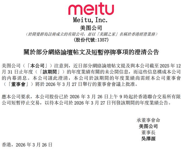 美图公司在公告中表示,应公司要求,公司股份已于2026年3月26日上午9时起于港交所短暂停止交易,以待公司于2026年3月27日刊发该期间的年度业绩公告。