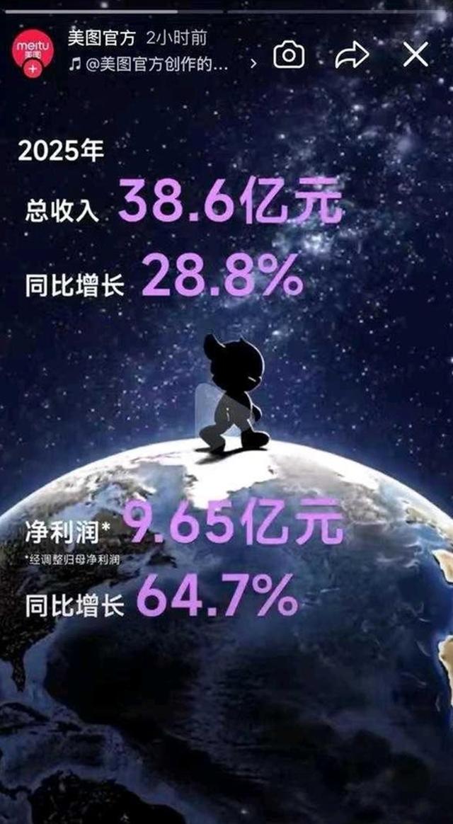 同时,美图公司2025年的经调整归母净利润9.65亿元,同比增长64.7%。另外,2025年,美图全球MAU(月活跃用户数)为2.76亿,其中,中国内地以外市场MAU突破1亿;全球付费订阅用户数1691万。