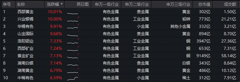 成份股方面,西部黄金、兴业银锡涨停,华锡有色、山金国际涨逾9%,洛阳钼业、西部矿业、紫金矿业、湖南白银涨超7%,湖南黄金、中稀有色等个股跟涨。