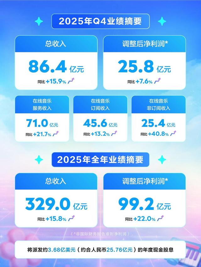 2026年3月17日,腾讯音乐娱乐集团(以下简称“腾讯音乐”)发布了截至2025年12月31日止的第四季度及全年未经审计财务业绩报告。数据显示,腾讯音乐2025年全年总收入为329亿元,创历史新高;调整后净利润为99.2亿元,在线音乐服务收入达267.3亿元。第四季度,腾讯音乐总收入为86.4亿元,调整后净利润为25.8亿元。其中,在线音乐服务收入同比增长21.7%至71亿元,在线音乐订阅收入同比增长13.2%至45.6亿元,在线音乐非订阅收入同比增长40.8%至25.4亿元,在线音乐付费用户数达1.274亿,ARPPU从2024年同期的11.1元提升至11.9元。同时,腾讯音乐宣布将派发约3.68亿美元的年度现金股息,切实回报投资者的长期信任。