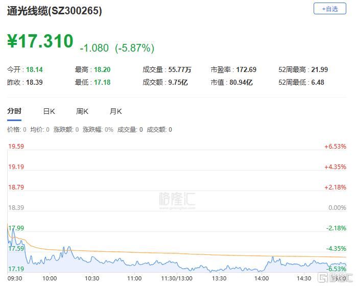 通光线缆跌5.87%报17.31元,最新市值80.94亿元。