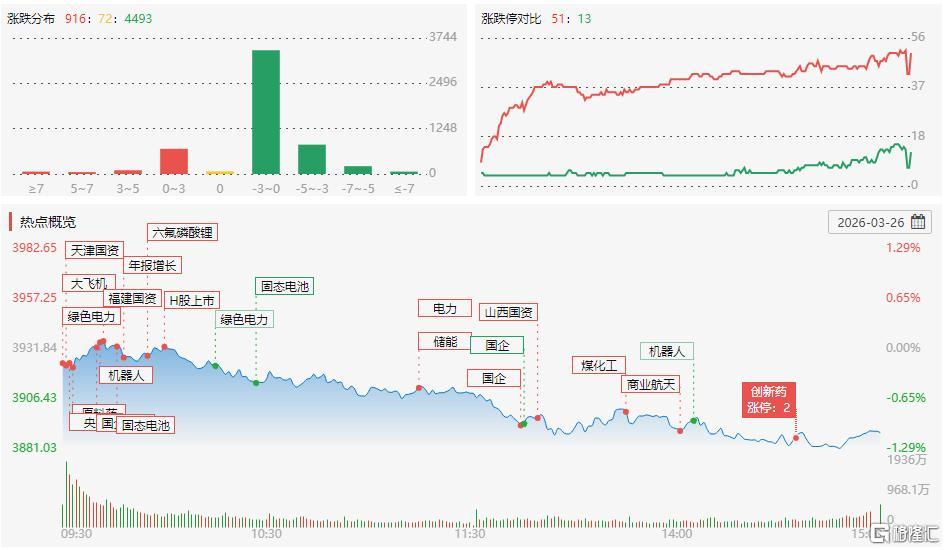 3月26日,A股主要指数下跌,沪指跌1.09%报3889点,深证成指跌1.41%,创业板指跌1.34%。沪深两市成交额跌破2万亿,较上一个交易日缩量2362亿,全市场超4400只个股下跌。