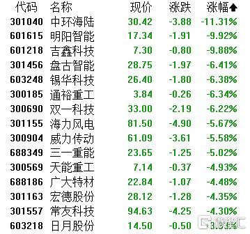 风电设备板块下挫,中环海陆跌超11%,明阳智能、吉鑫科技、盘古智能、锡华科技、通裕重工、双一科技等跟跌。