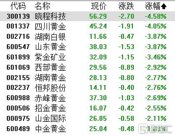 贵金属板块走弱,晓程科技、四川黄金跌超4%,湖南白银、山东黄金、紫金矿业、西部黄金、湖南黄金、恒邦股份等跟跌。