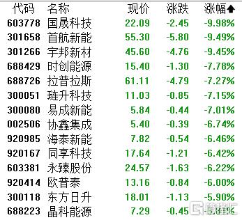 光伏设备板块低迷,国晟科技跌停,首航新能、宇邦新材、时创能源、拉普拉斯、琏升科技、易成新能、协鑫集成等跟跌。