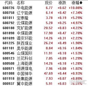 煤炭开采加工股活跃,华电能源涨停,辽宁能源、宝泰隆、云煤能源、兖矿能源、中煤能源、潞安环能、陕西煤业等跟涨。