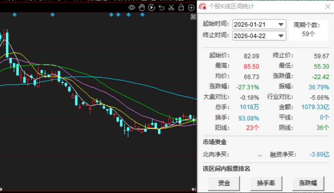 近三个月来看,拓普集团股价跌幅不少:2026年1月21日至2026年4月22日,股价从82.09元回落至59.67元,跌幅高达27.31%。(港湾财经出品)
