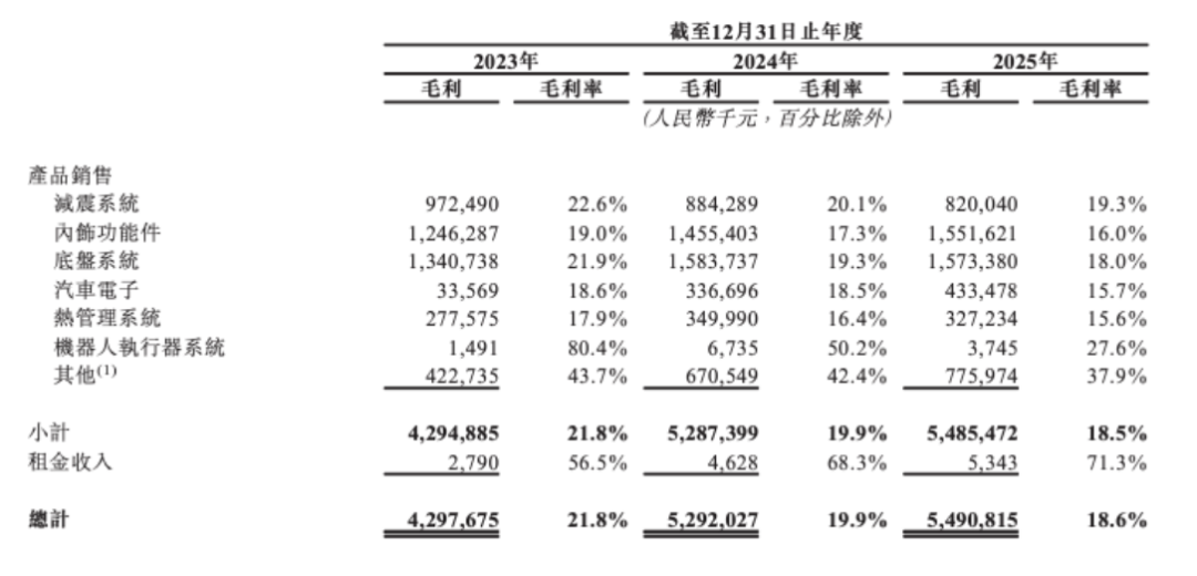 分业务板块看,核心产品减震系统毛利率从2023年的22.6%降至2025年的19.3%;内饰功能件从19.0%降至16.0%;底盘系统从21.9%降至18.0%;汽车电子从18.6%降至15.7%;热管理系统从17.9%降至15.6%;机器人执行器系统从80.4%降至27.6%;其他业务从43.7%降至37.9%,整体呈下行趋势。