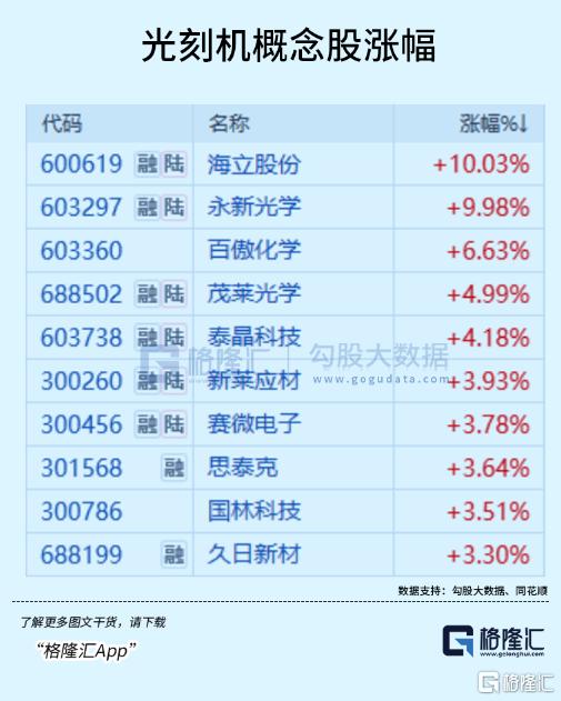 从今天盘面来看,半导体板块同样震荡走高,中芯国际涨2.36%。反应比较大的是光刻机概念。作为中国唯一一家掌握设计和集成整机光刻机的制造商,上海微电子在今年10月撤回了科创板IPO上市计划,但其对概念股的影响力颇大。