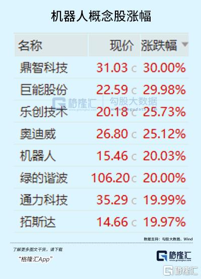 机器人概念今日掀起一阵涨停潮,同时也激活了减速器、汽车零部件、电机、PEEK材料等板块。个股方面,鼎指科技来了个30CM涨停,机器人、瑞迪智驱、拓斯达、天奇股份、爱仕达、昊志机电、丰立智能、江苏北人、江苏雷利等领涨。