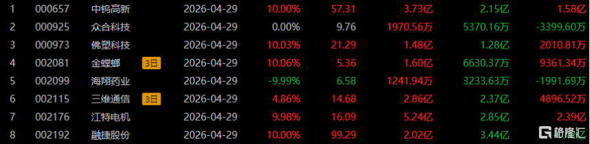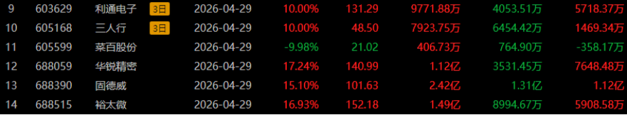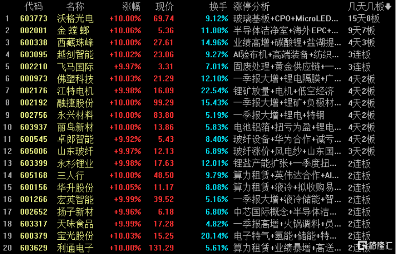 沃格光电15天8板,金螳螂9天7板,西藏珠峰4天3板,越剑智能、飞马国际3连板,佛塑科技、江特电机、融捷股份、永兴材料、丽岛新材、卓郎智能4天2板,山东玻纤3天2板,永杉锂业、三人行、华升股份、宏英智能、扬子新材、天味食品、宝光股份、利通电子2连板。