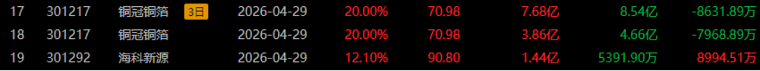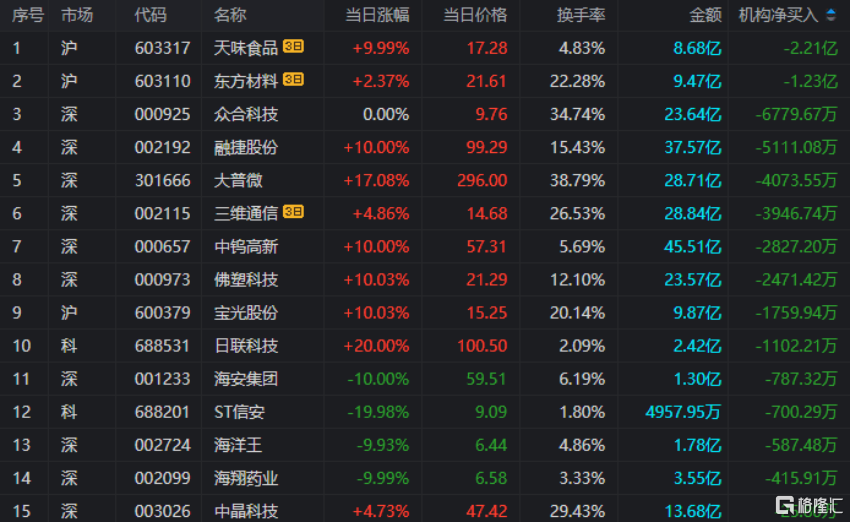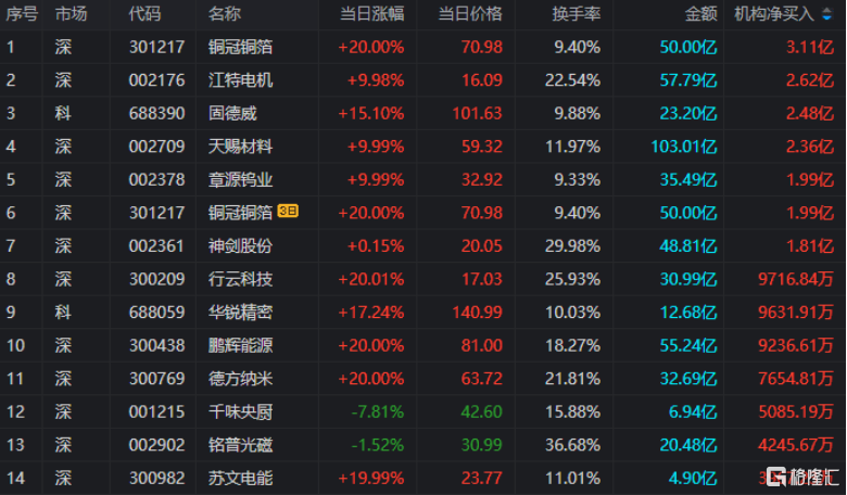 龙虎榜中涉及机构专用席位的个股中,单日净买入额前三为铜冠铜箔、江特电机、固德威,分别为3.11亿、2.62亿、2.48亿。