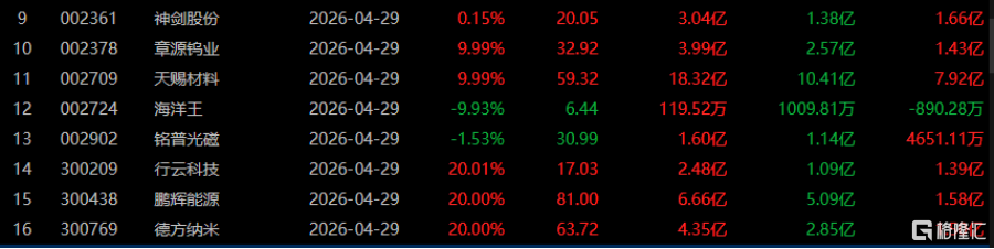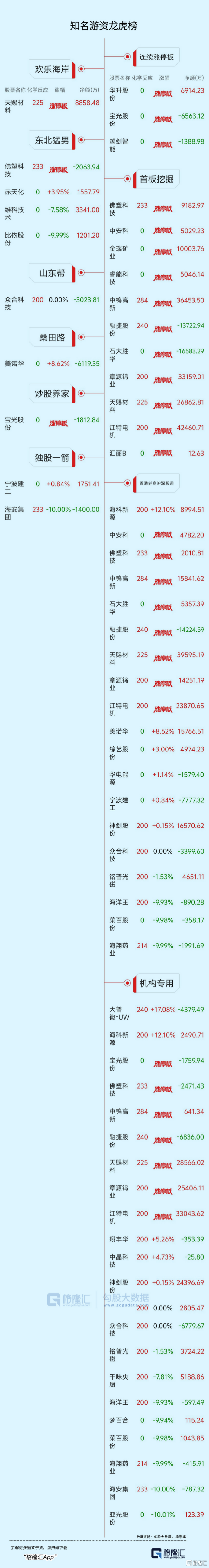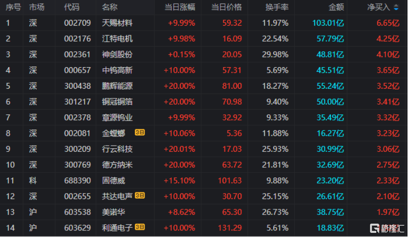 龙虎榜单日净买入额前三为天赐材料、江特电机、神剑股份,分别为6.65亿、4.25亿、4.10亿。