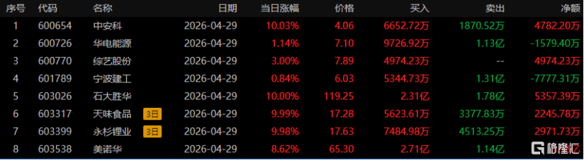 在龙虎榜中,涉及沪股通专用席位的个股有10只,美诺华的净买入额最大,净买入1.58亿元。