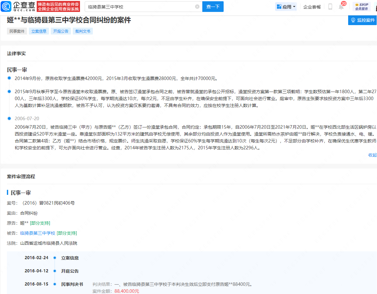 企查查APP显示,临猗县第三中学校负责人为梁满仓,开办资金1940万元,该校曾涉及与澡堂承包商的合同纠纷,因拒绝向澡堂承包商支付学生洗澡不足的补差款被山西省运城市临猗县人民法院判赔8.84万元。