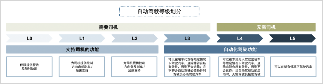 按照国际自动机工程师学会制定的SAE J3016分级标准,自动驾驶分级从L0到L5共六级,只有达到L3级(含L3、L4、L5)才真正进入自动驾驶功能级别。