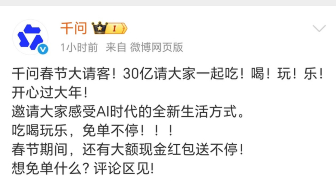 阿里也同样选择向用户生活场景出击,旗下千问AI启动了“春节30亿免单”活动,通过发放大额红包,激励用户通过千问调用淘宝闪购、飞猪等阿里系应用,比如叫外卖、订酒店等。