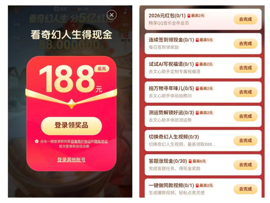 不同于腾讯、阿里“直接派钱”,百度则通过“小任务”的形式将红包与拍照搜物、视频创作等功能融合起来,让用户一边做任务,一边将AI功能用起来,重回“百度搜索”的使用心智。