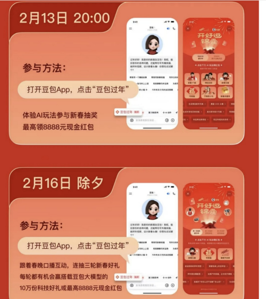 早早宣布旗下火山引擎成为春晚AI合作伙伴的字节,则最迟出招。直到近日,字节才正式宣布豆包将在新春期间发红包。
