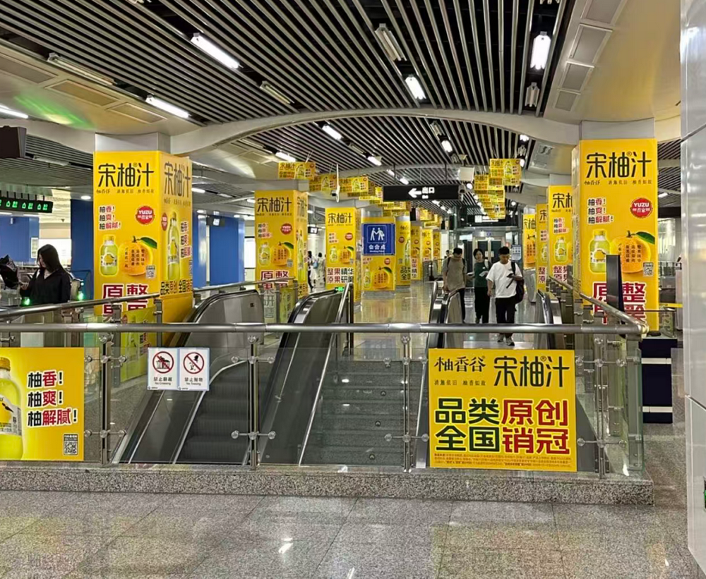 高销量背后离不开高强度的广告投放,从飞机场、高铁站、地铁站、到电梯、巴士、车厢内,宋柚汁的广告几乎铺满了城市的大街小巷。官方在广告中打出了全国销量连续多年第一的口号。
