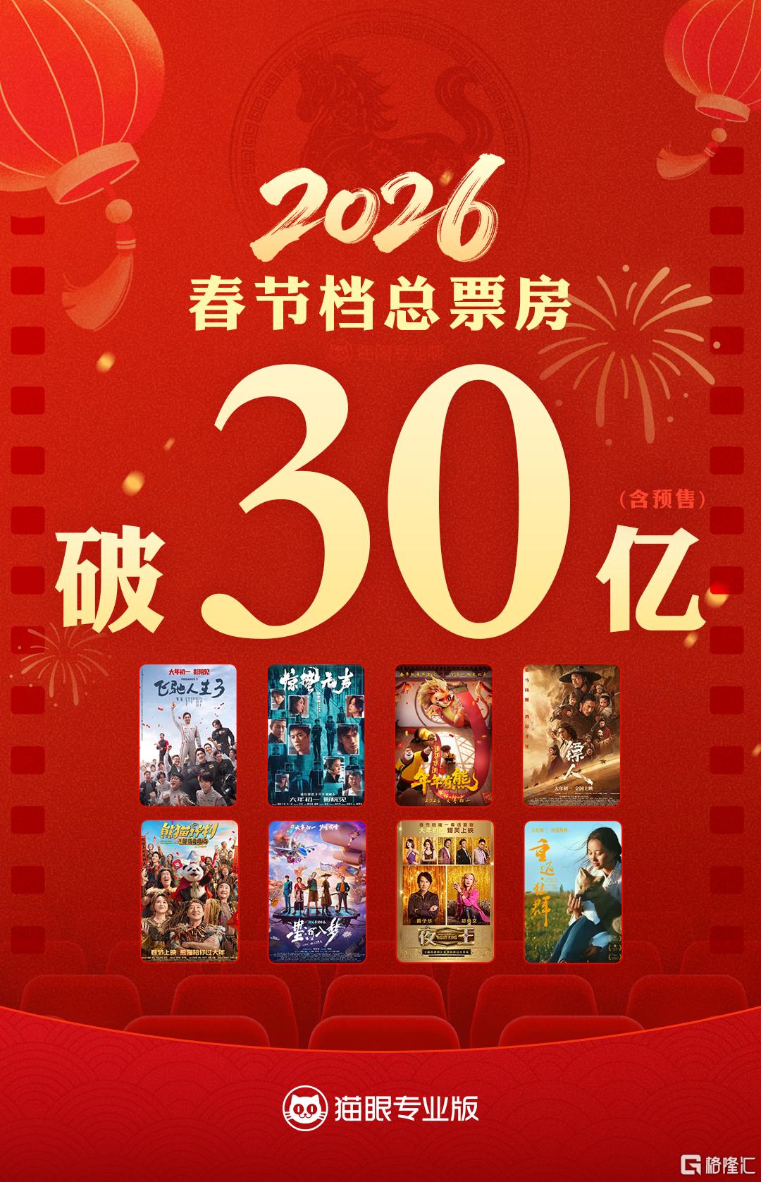 春节档方面,灯塔专业版数据显示,2026年春节档(2月15日—2月23日)电影总票房(含预售)已突破30亿元,截至2月19日21时,达到30.82亿元。