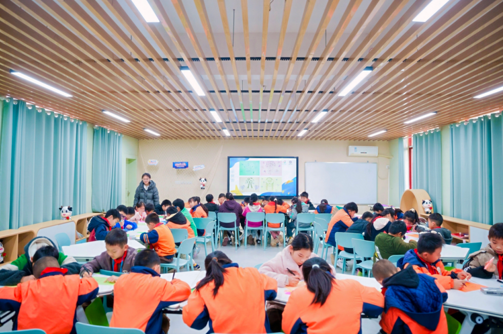 2025年秋季学期起,融合本地特色的美育课程在四所学校全面开展。孩子们通过绘画、手工、音乐等形式自由表达;美育教室也同时成为教研、阅读与展示的多元空间,真正实现“一室多用、功能融合”。