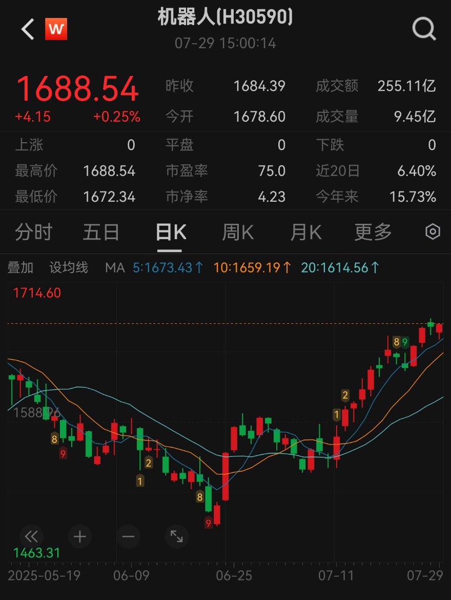 机器人行业展现出强劲的反弹趋势,从市场表现来看,今日人形机器人上涨 0.25%,近期仍处于反弹区间。