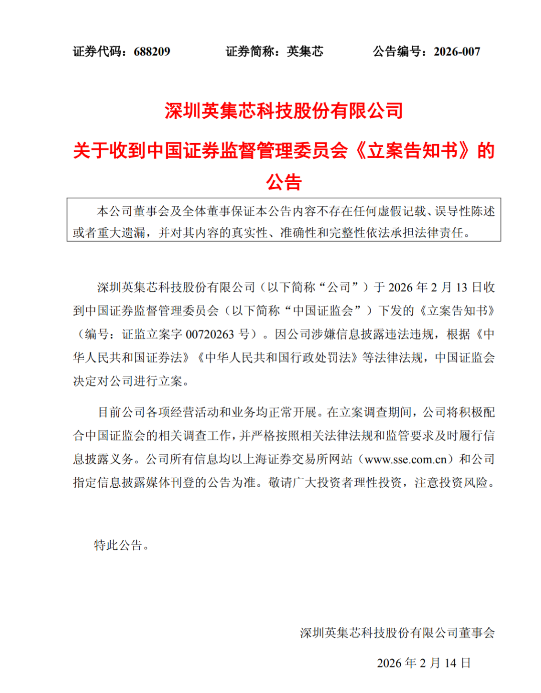 2月13日晚,英集芯(688209.SH)发布公告称,公司收到中国证券监督管理委员会下发的《立案告知书》,因涉嫌信息披露违法违规,决定对公司进行立案调查。