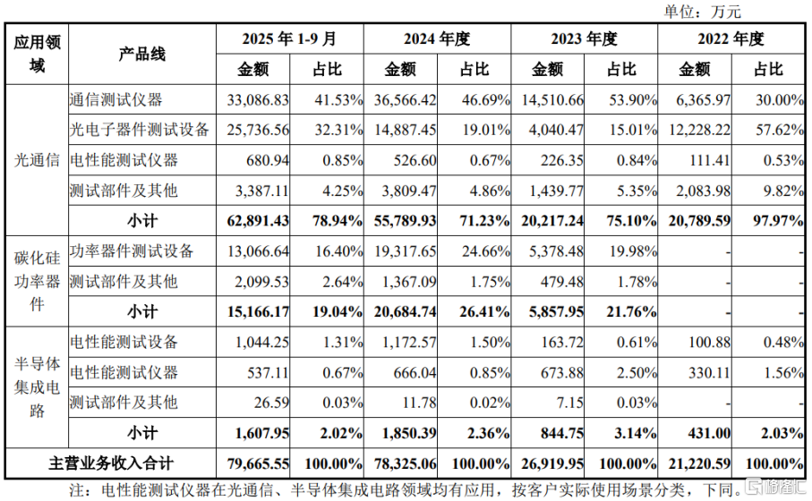 联讯仪器的产品主要应用于光通信、碳化硅功率器件、半导体集成电路等领域,主要客户包括中际旭创、新易盛、光迅科技士兰微等。2022年至2025年1-9月(简称“报告期”),联讯仪器70%以上的营收来自光通信领域,占比较大。