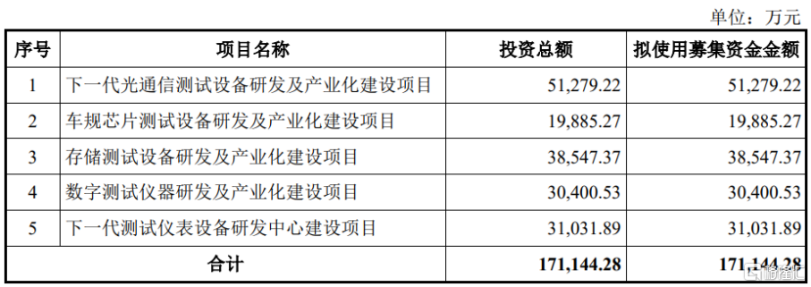 本次IPO,联讯仪器拟募集资金约17亿元,按发行价格计算的预计募集资金总额约21亿元,将用于下一代光通信测试设备研发及产业化建设项目、车规芯片测试设备研发及产业化建设项目、存储测试设备研发及产业化建设项目、数字测试仪器研发及产业化建设项目、下一代测试仪表设备研发中心建设项目。