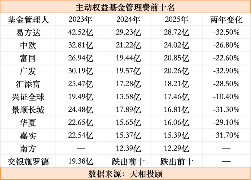 根据天相投顾数据,易方达的主动权益管理费从2023年的42.52亿跌到2025年的28.72亿,两年缩水超过三成,但它依然是行业第一,与第二名拉开将近5亿的差距。而两年前还排在第十名、管理费接近20亿的交银施罗德,已经连续两年从前十榜单上消失。