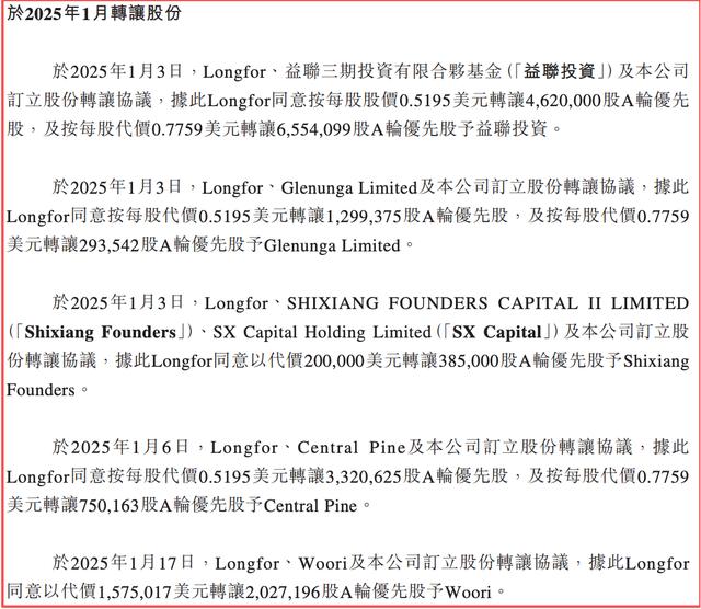 2025年1月,Longfor向益联投资、Glenunga Limited、Shixiang Founder、SX Capital、Central Pine、Woori分别转让了所持暖哇科技的部分股权,价格分别约为746.88万美元、305.85万美元、20万美元、230.71万美元和157.50万美元。