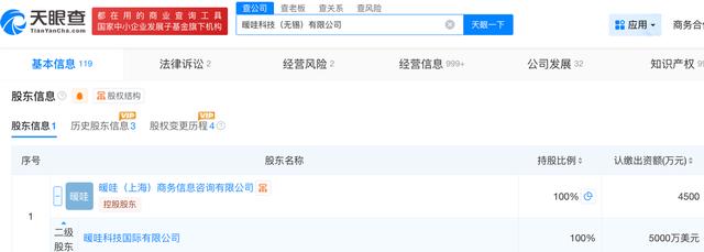 天眼查App信息显示,暖哇无锡指的是暖哇科技(无锡)有限公司,前称为上海暖哇科技有限公司。目前,该公司的注册资本为4500万元,法定代表人为卢旻,由暖哇(上海)商务信息咨询有限公司全资控制。