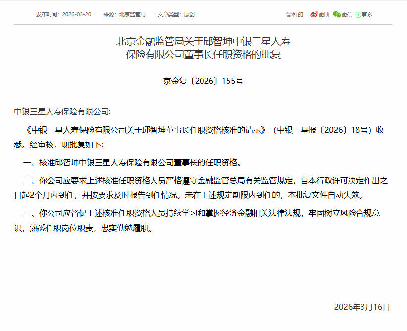 今日,北京金融监管局发布批复,核准邱智坤中银三星人寿保险有限公司(下称“中银三星人寿”)董事长的任职资格。