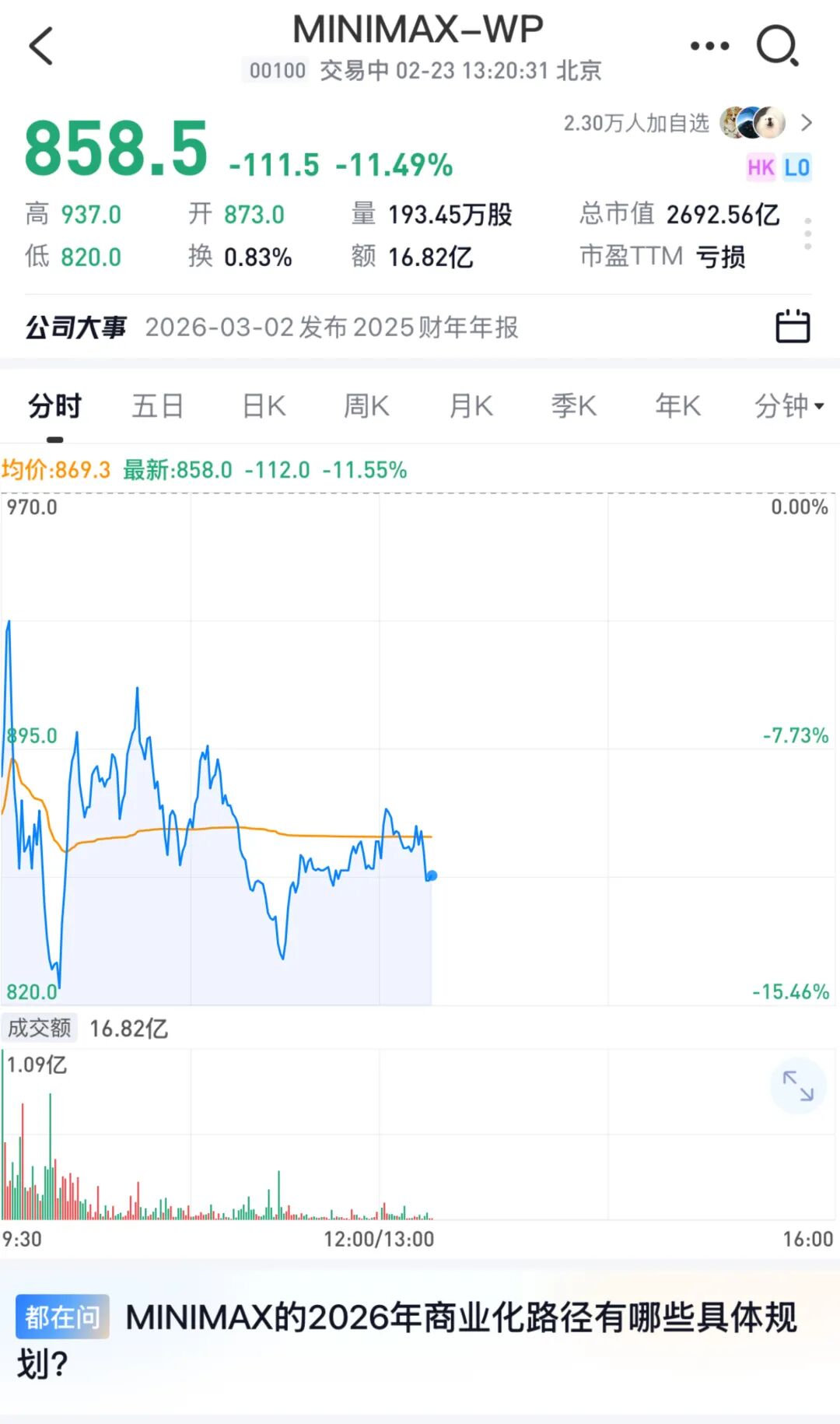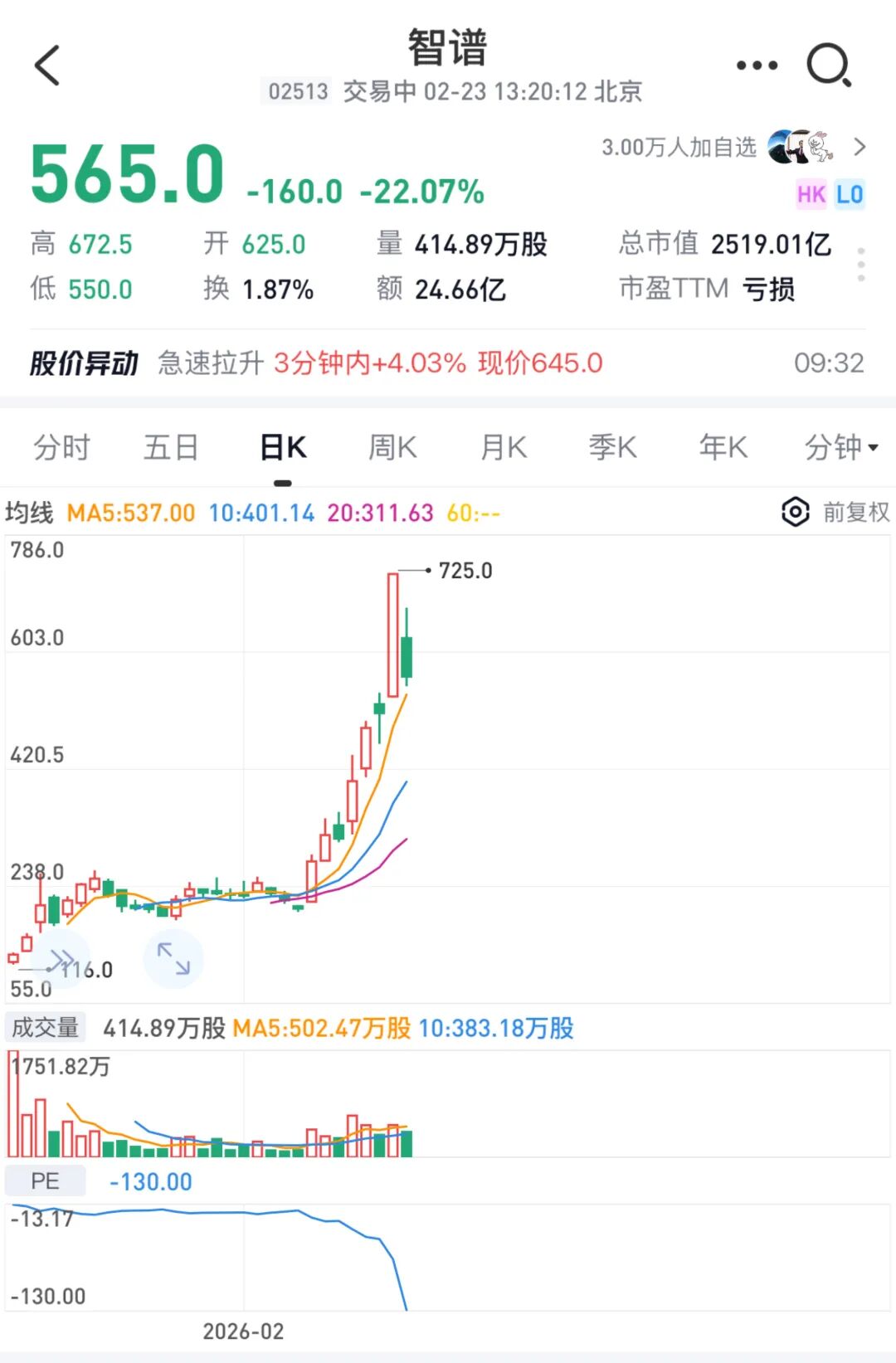 2月12日,智谱正式推出新一代旗舰模型GLM-5,表现亮眼。其在2月9日至2月20日两周的交易中取得近250%的涨幅。在2月20日更是单日狂涨超40%,市值突破3200亿,截止今日午间收盘,其市值约为2500亿,单日蒸发超700亿。