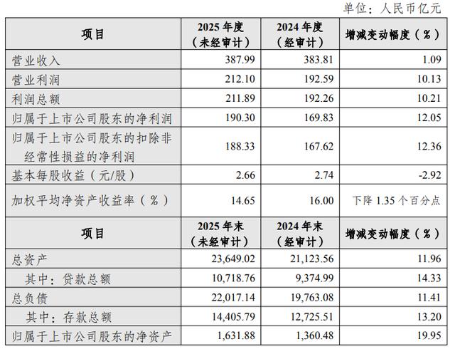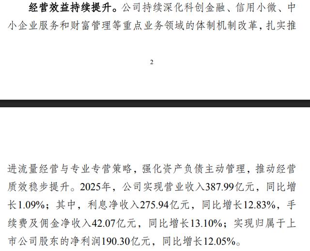 其中,杭州银行当下面临的一大挑战是,增利不增收。杭州银行2025年度业绩快报公告显示,其2025年实现营业收入387.99亿元,同比增长1.09%;归属于上市公司股东的净利润190.30亿元,同比增长12.05%。